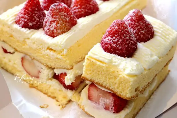 鵝黃色的海棉蛋糕體,與鮮紅色的草莓,加上厚厚的鮮奶油,整個外觀實在太誘人了!