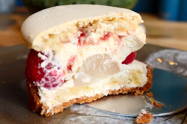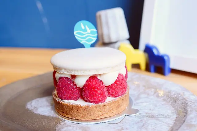 外觀像個巨大馬卡龍,實際只有頂蓋是馬卡龍,餘下是個豐富的水果塔!