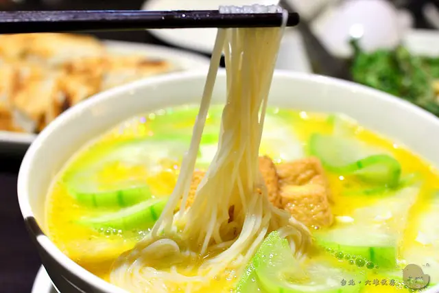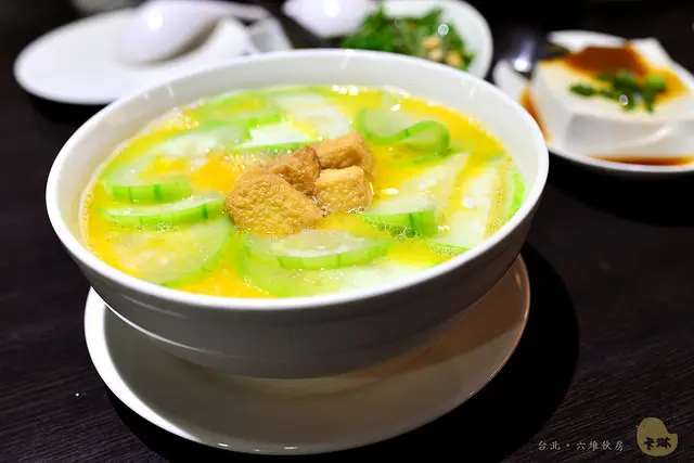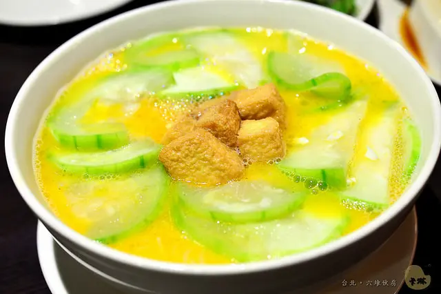 金黃色的湯底是將鹹蛋蒸熟後絞碎、炒香再加入,最後還經過過濾程序,所以雖然喝得出鹹蛋,卻很細不會有太影響口感的大顆粒,每一口都能均勻嚐到絲瓜淡淡鮮甜及鹹蛋香。
