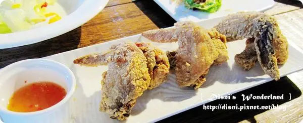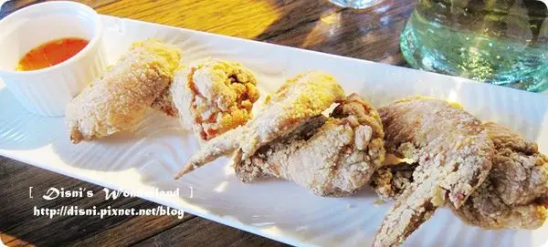 一份是三組雞翅+小腿,一旁的醬有點像泰式的,不太會辣,但有泰式的酸酸味,