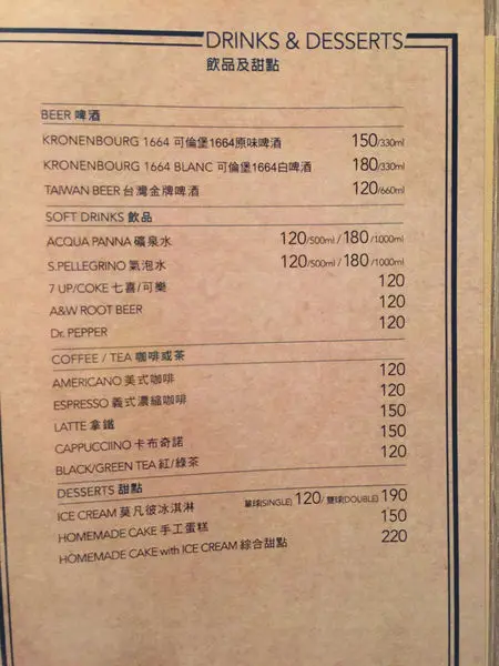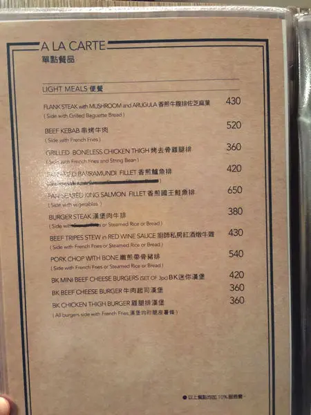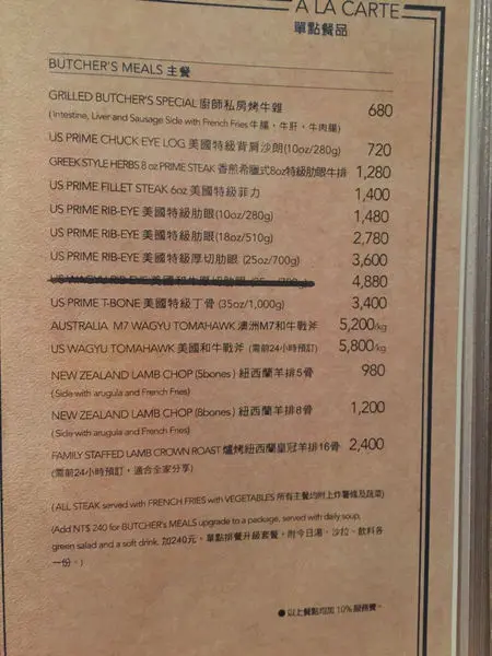 除了高單價的戰斧牛排外,也有漢堡類、牛排套餐、沙拉、前菜和限量的義大利麵類可以選