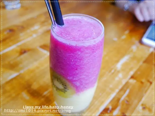 下面喝起來有香蕉、蘋果、奇異果,上面是火龍果