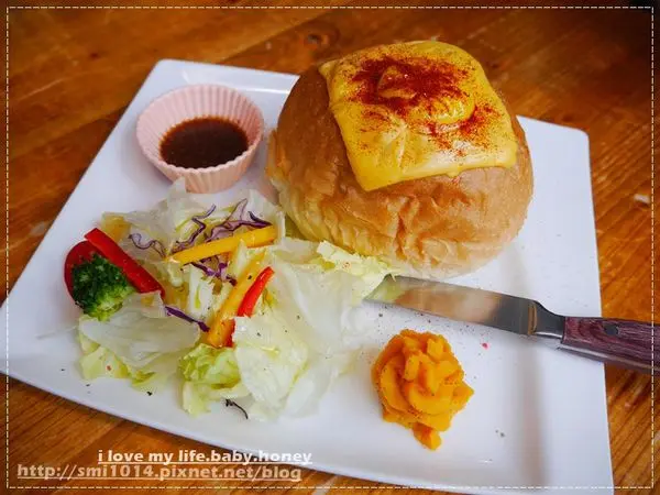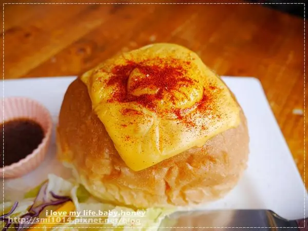 一個大大的麵包,上面覆蓋著起司,感覺切開後會有驚喜這樣
