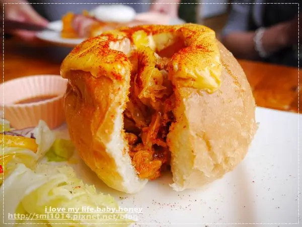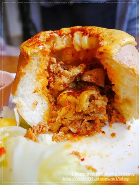 麵包裡面是泡菜豬肉,上面半熟的蛋黃液順勢流到裡面去