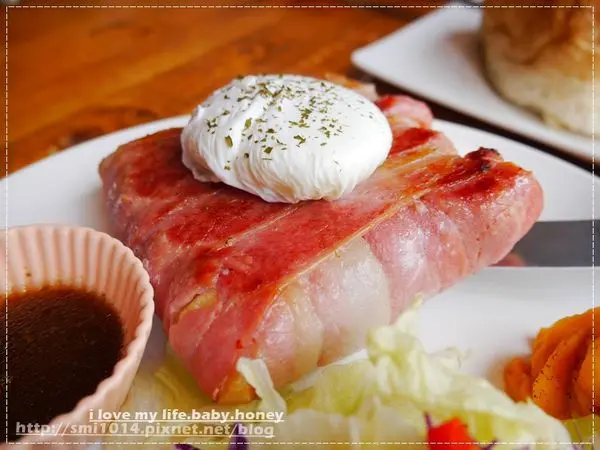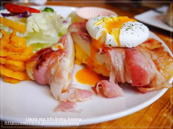 外表的培根微鹹帶點酥脆的口感,半熟蛋黃讓三明治入口帶著濕潤感