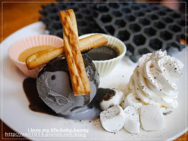 芝麻花生口味的鬆餅還附上一球芝麻口味的冰淇淋