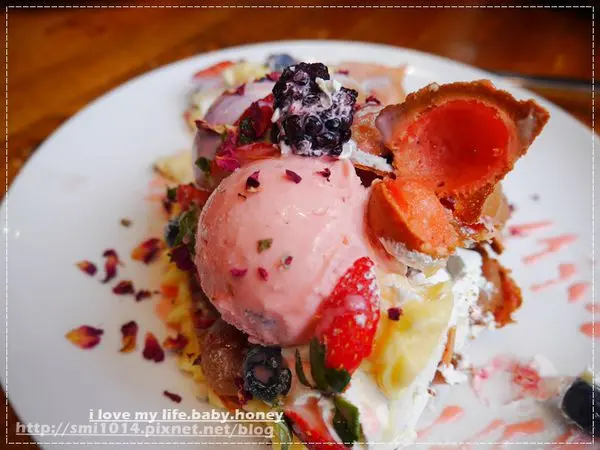 外面撒上白色的糖粉,淋上玫瑰花醬 讓人食指大動
