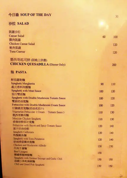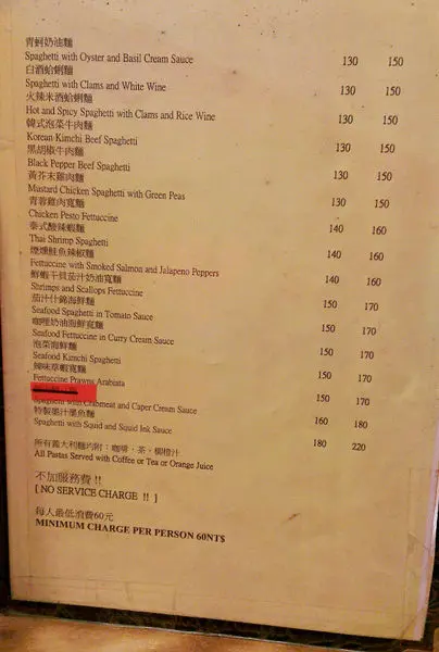 兩頁洋洋灑灑寫下來也有二十幾樣,價格也都非常平易近人最低的九十起跳,+20元可以升級大份。而且每份義大利麵都有附飲料,奶/紅茶、咖啡、柳橙汁任選,最最佛心的是他不收服務費,但他的服務非常好,揪甘心欸!