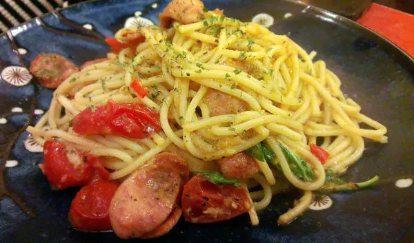 這是小份的,但對女生來說份量非常足夠,我覺得甚至有點太飽,麵都可以選擇細麵或寬麵。雖然價格才130元,但他給料真的很大方,香腸超級多,還有小番茄。這邊只是冰山一角,大家應該還可以看到麵裡以及例外一邊都隱隱約約有香腸的蹤影吧,超級豐盛。