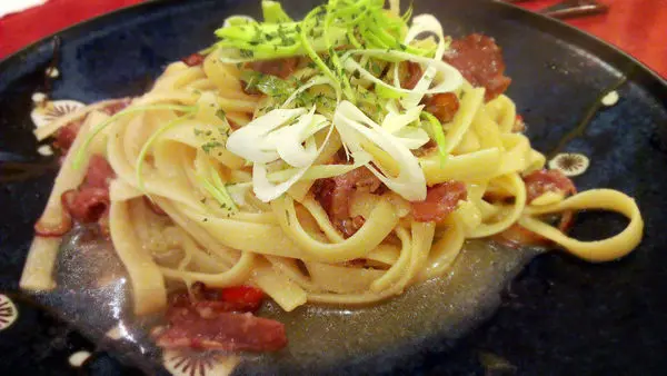 我點的是寬麵,一樣彈牙有嚼勁。這道比較像是台式義大利麵,蒜香很重,鴨賞吃起來鹹鹹跟義大利麵還挺合的。