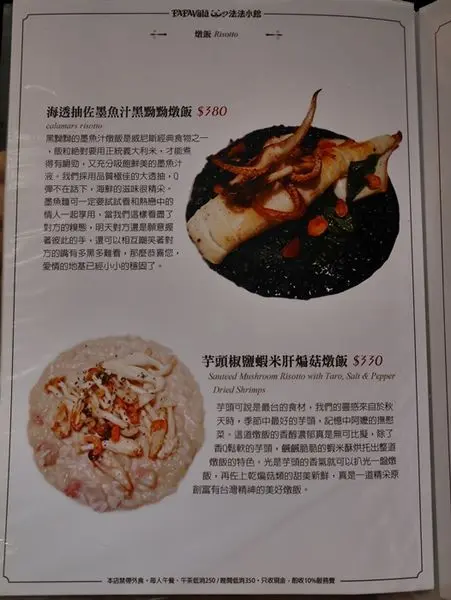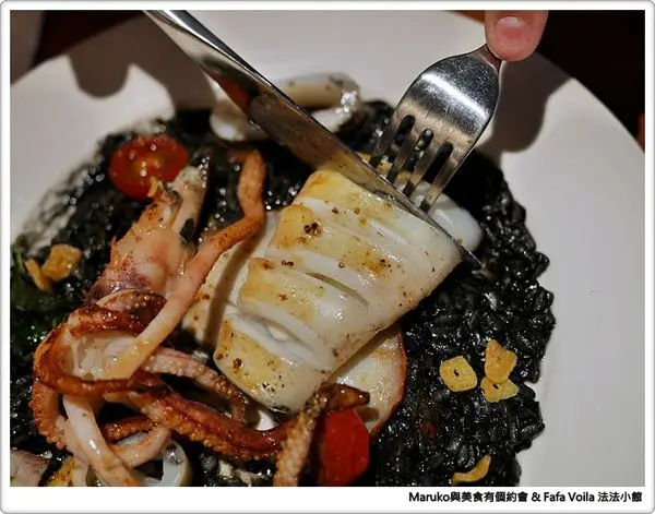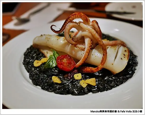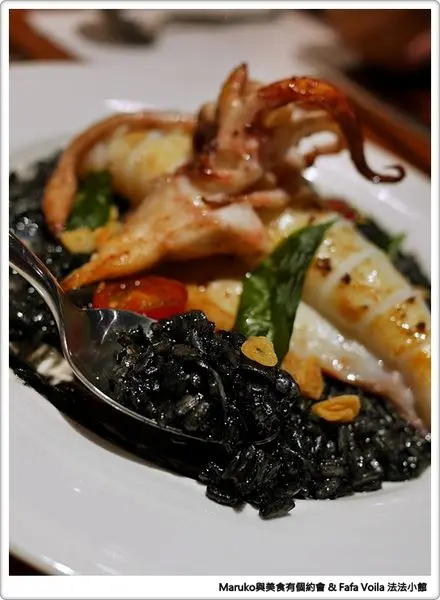我算是第一次吃墨魚燉飯吧!一直怕吃到不好吃的墨魚燉飯所以沒有點過。(其實是怕牙齒黑黑的,XD!)不過美食當前,當然要好好享受一下黑嚕嚕的滋味,其實燉飯的份量並不會很大,主要是希望來店裡用餐的客人能覺得分量剛剛好的美味,而不是超級飽足的滿足感,畢竟法國料理本來就是給人一種享受的滿