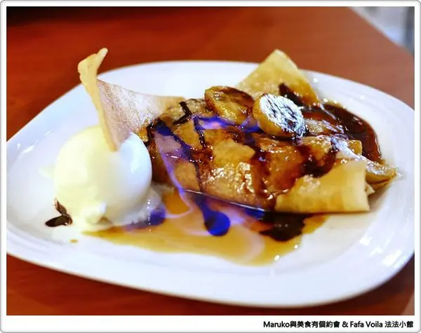 這份迷人的可麗餅送上桌後會淋上萊姆酒再點上火,現場的桌邊秀可是非常讓人新奇,而法式可麗餅也是店內主要的明星商品,而我選了這款萊姆酒香蕉口味的法式可麗餅,其實酒精濃度在經過火焰的燃燒以後會降低許多,但因為多了巧克力的甜味,酒味會稍微降低許多。