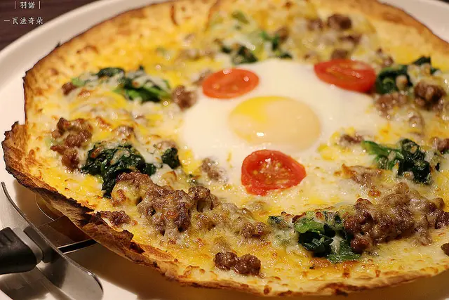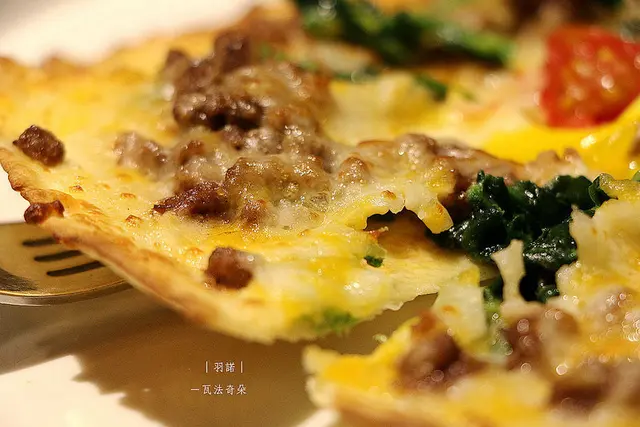 義式薄脆餅皮披薩 裡面有牛肉 波菜及特調醬料 吃起來相當滿足