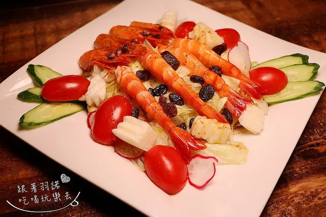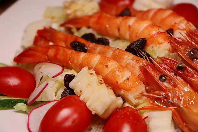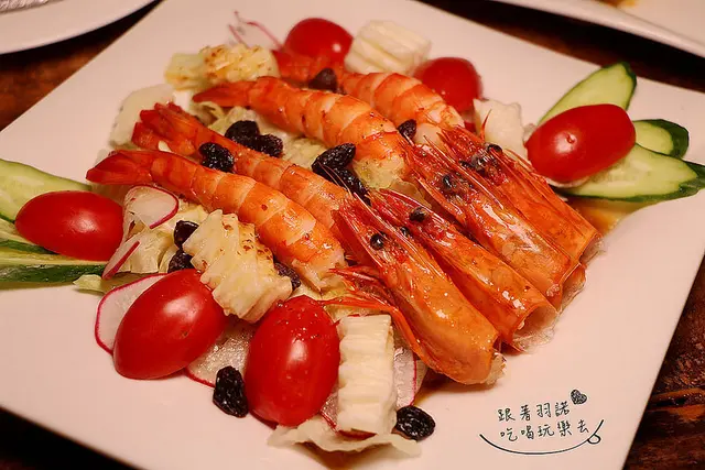 整桌的海鮮和肉肉也該吃點蔬菜調合一下了!!鮮脆的蔬果生菜上擺放鮮蝦 更貼心的是蝦子還事先去殼 非常方便食用