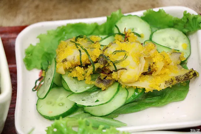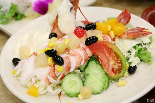 大明蝦沙拉一上桌就讓人驚豔 來自澎湖的大明蝦切片擺盤 再用高麗菜絲鋪底 一旁還有小黃瓜 水果丁 蓮子 番茄點綴 用料相當豐富新鮮明蝦搭配上美乃滋吃起來口感很有彈性 配上生菜更有層次感