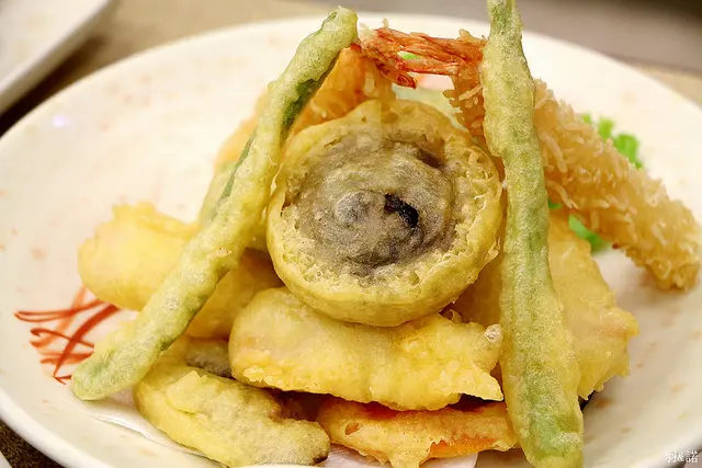 綜合天婦羅裡面有炸蝦和炸旗魚 豆子 茄子 地瓜 青椒 香菇炸的也還不錯 不會太油 種類也很豐富呢