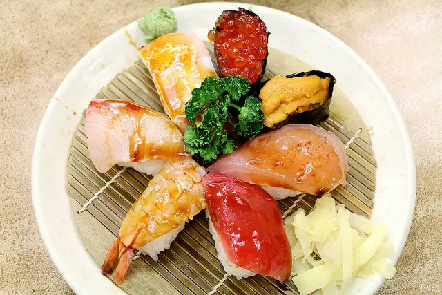 上乘綜合握壽司嚴選新鮮海膽 鮪魚 鮮蝦等頂級食材 上乘的肉質搭配香甜醋飯 一口塞一貫 各個味美鲜甜 超幸福滿足的啦!!