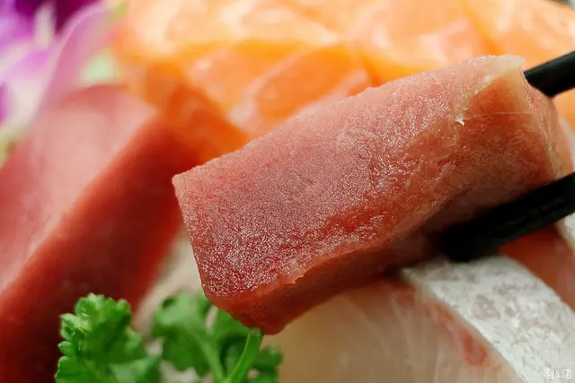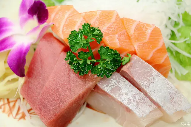 綜合生魚片有大片厚實的鮭魚 旗魚 紅魽