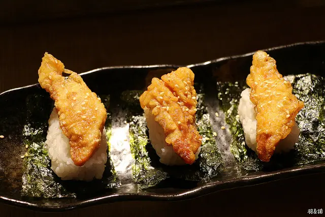 是以炸雞胸肉搭配海苔包裹成飯糰