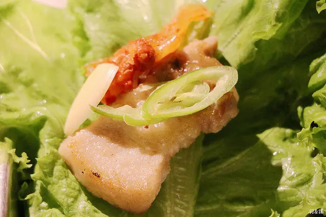 生菜包裹著豬五花一起享用少了油膩感 倒多了生菜的爽口喔