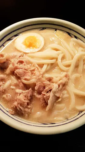 豚骨烏龍麵 L 149元首先說上面的那顆糖心蛋好惹~外皮軟嫩的蛋白包裹著入口即化的蛋黃 以極快的速度擄獲了諾咪的心 再來配著濃郁的湯頭挾帶著Q彈的麵條每一口都能吃的出蒜頭挾帶著大骨的香味 連本身比較沒味道的豬肉片也能嚐出它肉質的甜美! 讓諾咪的心徹底被融化!!