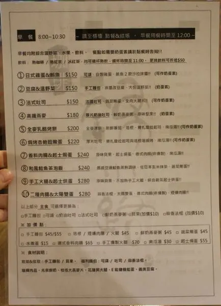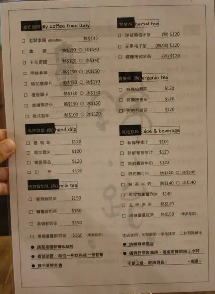 店家原則: 不接待12歲以下兒童。不能攜帶寵物、每人低消一杯飲料(或一份主食)、不接待 8人以上團體。