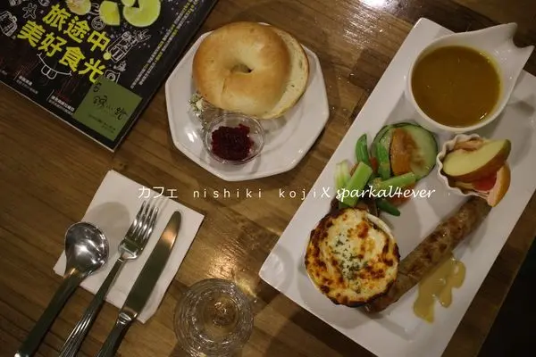 Nishiki Koji (珈琲 錦小路) is a kyoto-style breakfast restaurant. You can enjoy japanese breakfast, lunch, and afternoon tea here. I ate bagel set, which cantains Spices Sausage & Cheese Baked eggs. Quite delicious! You can also find some japanese style vessels and glass, fine art and practical goods.