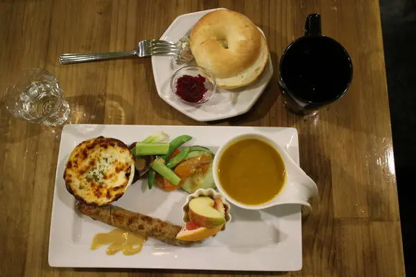 不會輸給貝果專賣店,有附兩種抹醬,加熱過的奶油跟自己煮的蔓越莓醬。