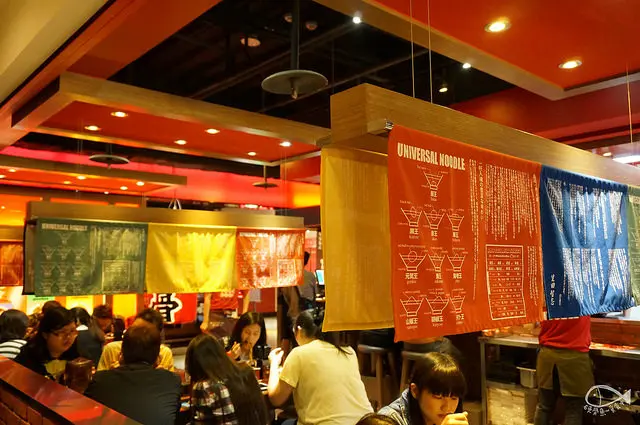 天花板用許多印有拉麵圖像和日文的布簾做裝飾