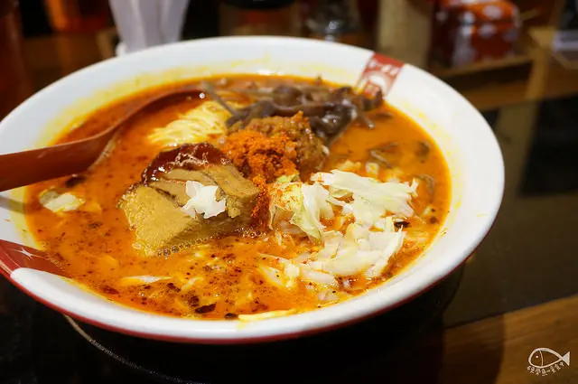 加入辣油、唐辛子等辛香料後湯頭變得紅通通的