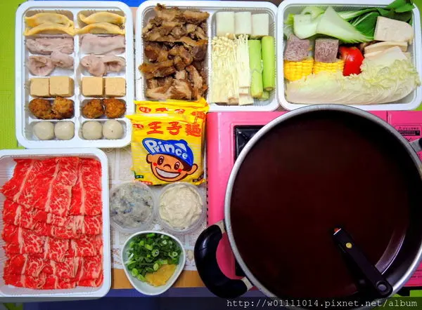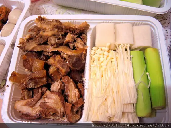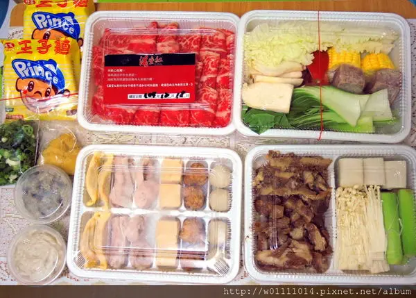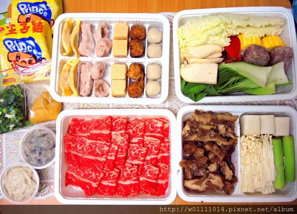 接下來就是照片中的四大盒肉片、火鍋料以及青菜跟大腸頭等滷味