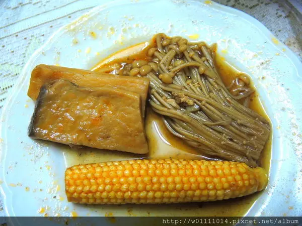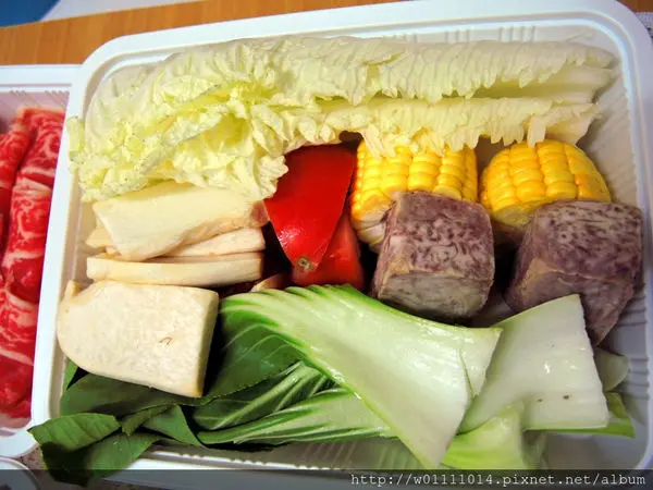 這盒有:青菜、芋頭塊、玉米、蕃茄塊、杏鮑菇片~
