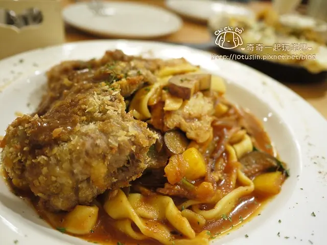 美式鄉村炸牛排,附番茄義大利寬蛋麵 $280