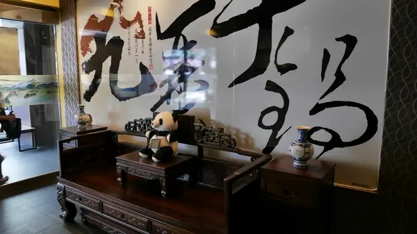 門口擺放著一隻熊貓玩偶,超想過去坐在旁邊跟他一起拍照的啊~~這坐椅古色古香的,擺在這邊超大氣的啊~
