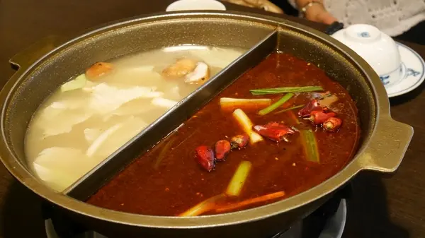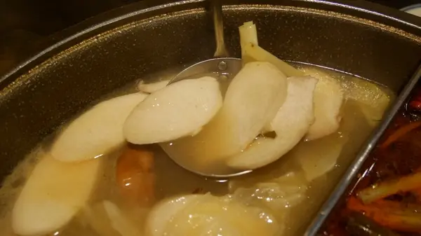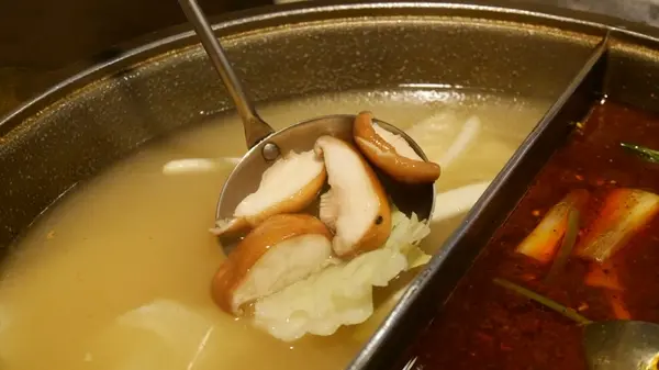 另一邊白鍋,則是用雞、蔬菜及干貝、海鮮等熬煮出來的,還沒放食材下去煮,光喝這原味湯頭就很棒了!