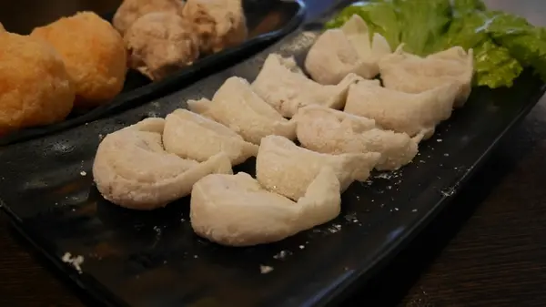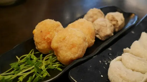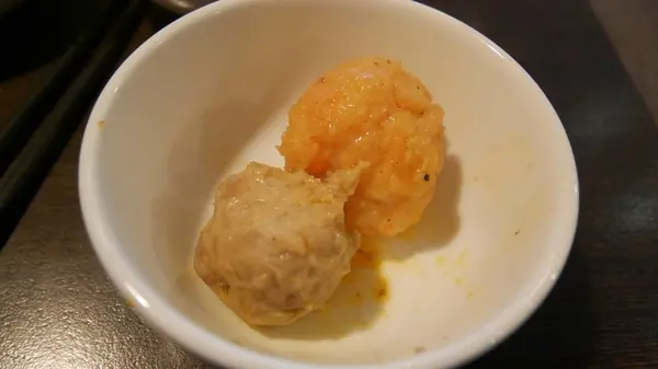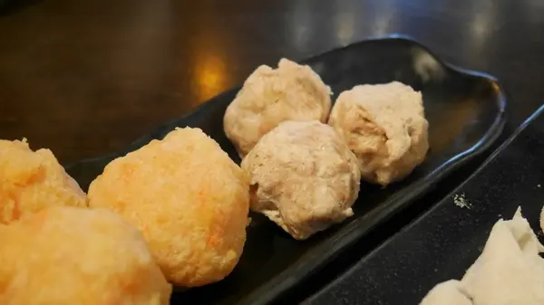 先送上店裡的人氣商品,左邊黃色大大顆的手工起司蝦丸跟芋角鮮肉丸,右邊的則是魚餃。