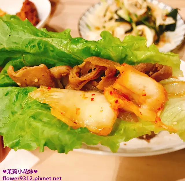 之後就用生菜包肉,再加入剛剛的小菜韓式泡菜
