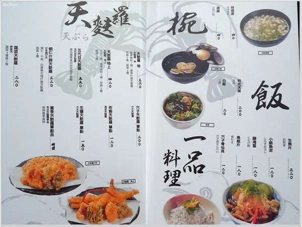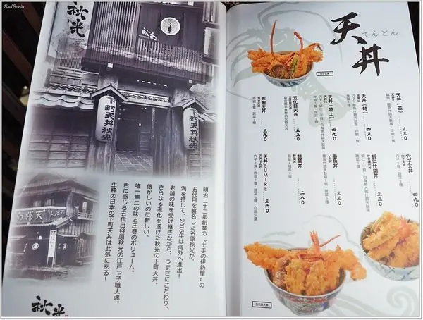 打開菜單,也印刷得很精美。第一頁是店家的歷史介紹,創辦人谷原秋光為日本百年天丼名店「土手の伊勢屋」第五代傳人,將百年老鋪的美味也帶到台灣來!