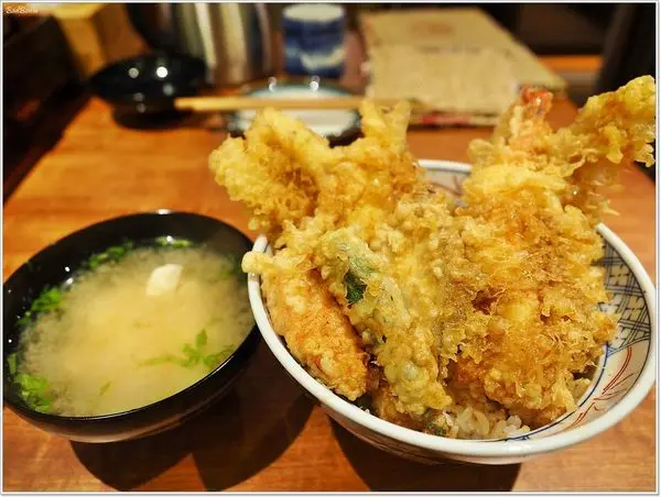 不要看丼飯跟味噌湯擺在一起就以為丼飯都有附湯唷~這味噌湯是要另外點的。五代目天丼內有穴子(星鰻)、炸蝦,以及多種當季新鮮食材,滿滿一碗。