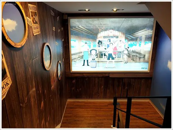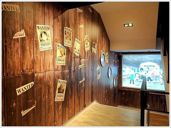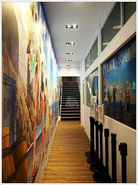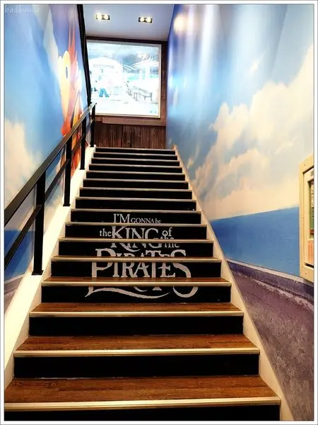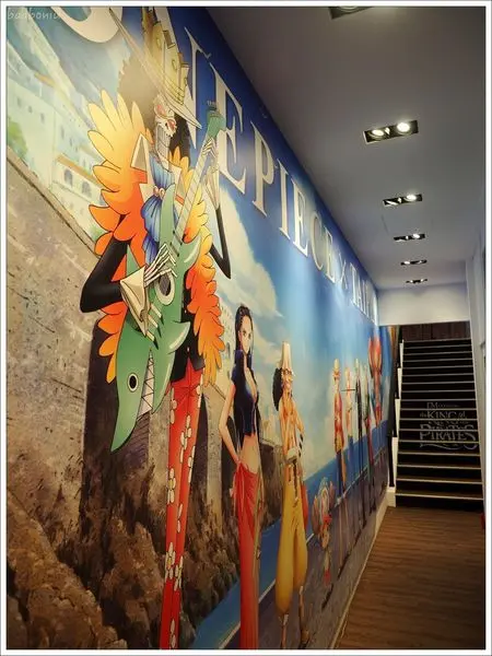 餐廳要上到二樓,走過狹長的走道,也是巨幅海賊王。其實只要把這條走道開放,馬上就會變成熱門打卡點,就知道海賊王的魔力超大。