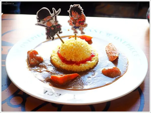 「咖哩藍帶豬排飯$360」,飯的造型是魯夫的帽子,上面插著魯夫。飯跟咖哩醬有點冷冷的,應該是還沒加熱完全吧XD~