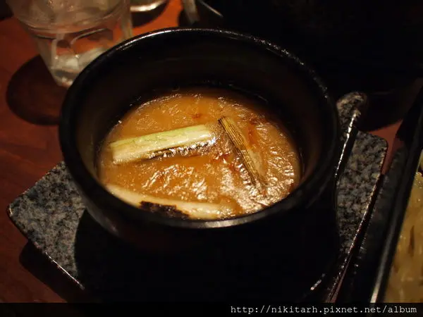 湯汁也跟拉麵是一樣的,看上面那層結凍的薄膜,就知道油脂量很驚人吧~據說是有加了女性很喜歡的膠原蛋白在裡面。不過後面還有一碗蕎麥飯,我們連這碗麵都吃不完了,所以沒等到上飯就走人,就沒拍到那碗飯了。