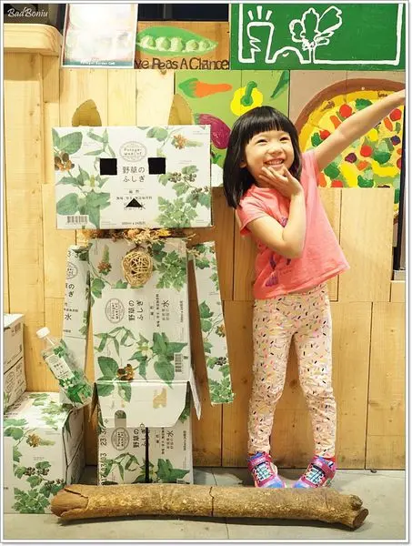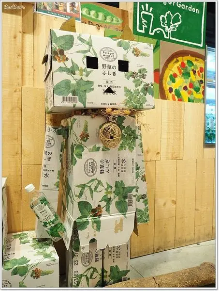 門口還有好多野草水紙箱堆疊出的金字塔,更特別的是還有一位野草水紙箱"阿愣"喔~(等一下會介紹它真正的名字)