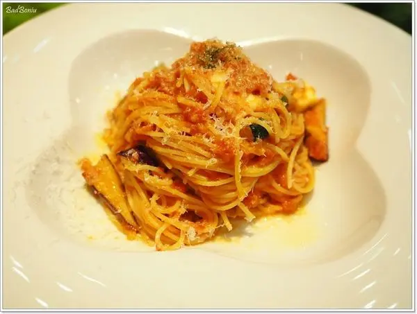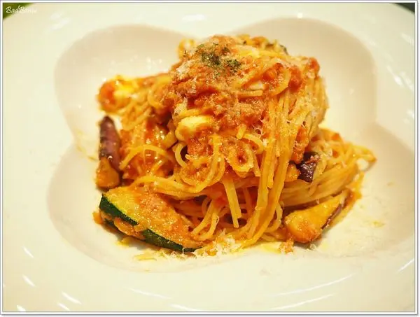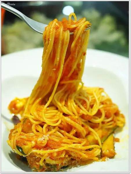 因為上次吃過這一道田園蕃茄蒜味義大利麵($360),波妞超愛,所以這一次還是點這一道。