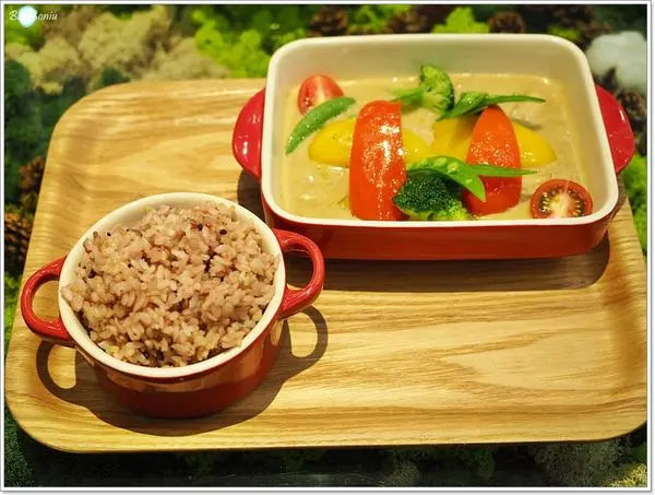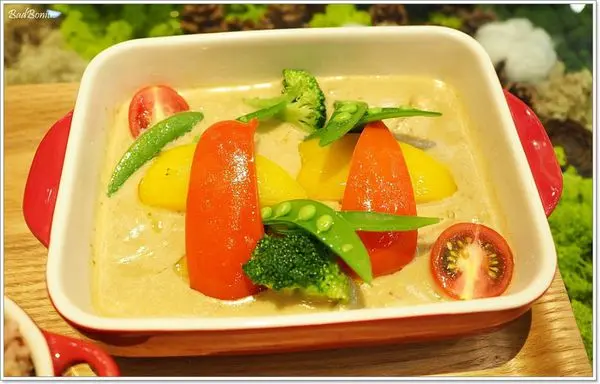 既然是野菜咖哩,主角當然是大量的野菜,但旁邊的綠咖哩卻意外的好吃!椰香比例剛剛好,連不太愛吃椰香的波妞媽都能一口接一口,微辣的綠咖哩在炎炎夏日中真的是很下飯!