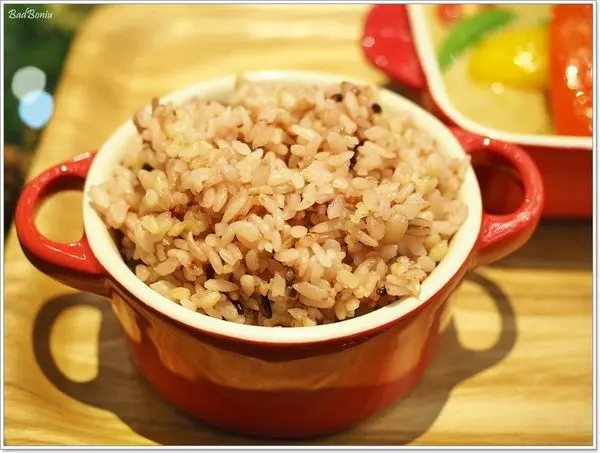旁邊搭配的飯也選擇了紫米飯,減少了熱量、增加了健康及飽足感。