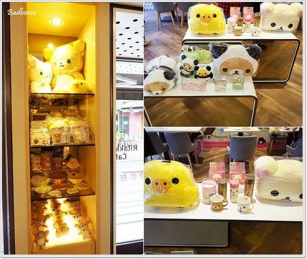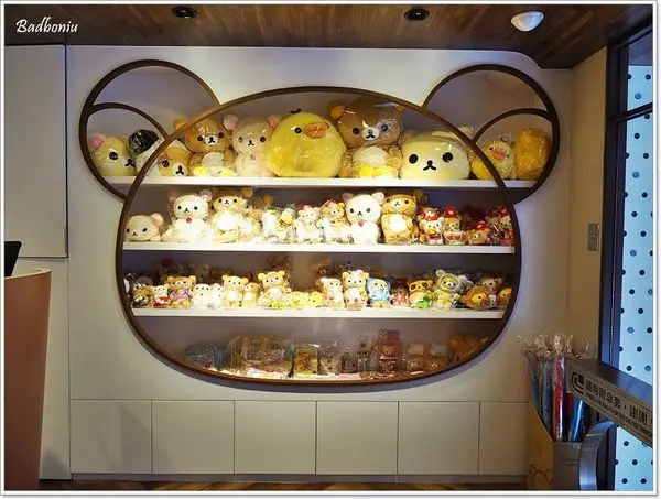 櫃檯旁販售一整面的拉拉熊週邊商品,真是讓人每一個都好想帶回家! 連櫥窗都是懶熊的頭呢