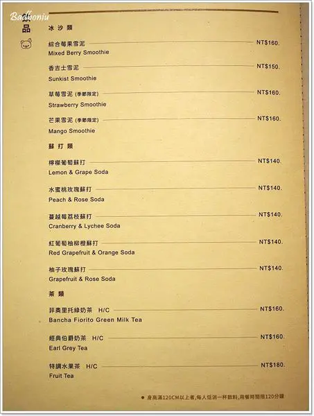 每個人的低消是一杯飲料,用餐限時120分鐘(從入座後開始起算)。所以建議坐下來先點完餐再去拍照,不然等到出餐已經過了不少時間了。