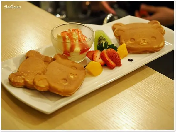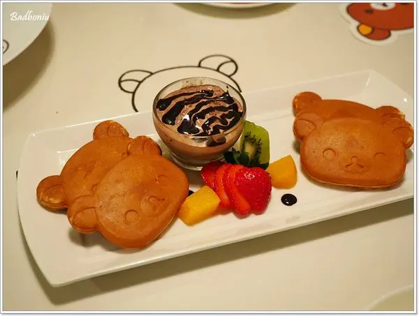 最後上桌的甜點,拉拉熊原味鬆餅;共四片,吃起來很像雞蛋糕,吃起來跟外觀一樣樸實。