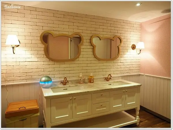 廁所走鄉村風,粉紅色的色調充滿濃濃的少女風,連牆上的鏡子也是拉拉熊的造型,很多女生一進來應該都會為之瘋狂吧!